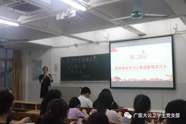 2018年4月27日晚,博彩网站推荐 党总支学生支部在越秀校区12栋3B室举“全面深入学习十九大内容及精神”的专题学习培训活动,支部书记刘宇珊老师出席活动。本次活动以“时事政治学习之我是新闻发言人”、“我为十九大一站到底”、“英语古诗词互译”三个环节为主要内容进行学习。