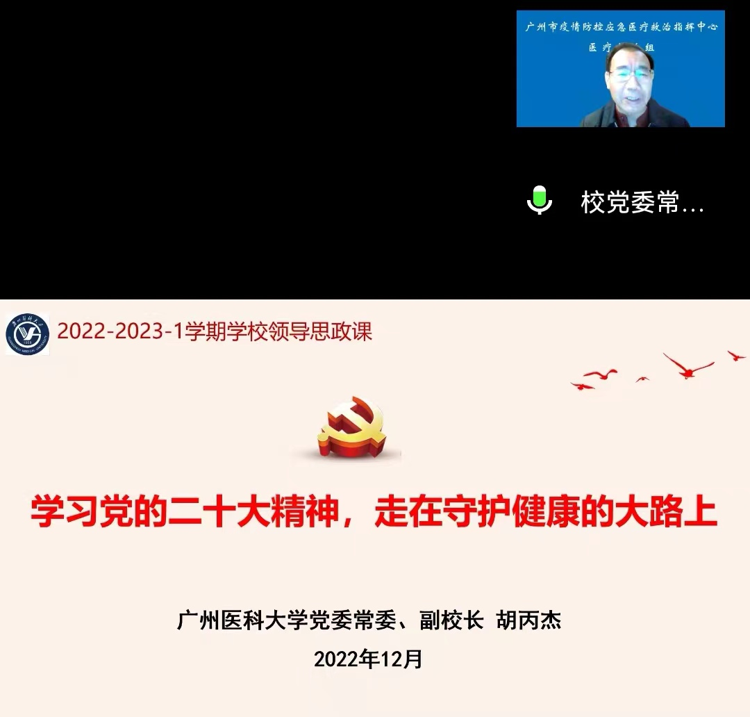 2022年12月13日,胡丙杰副校长为博彩网站推荐预防医学、食品卫生与营养学两个专业的本科生代表讲授主题为“学习党的二十大精神,走在守护健康的大路上”的思政课。