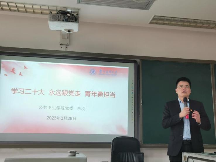 3月28日下午,博彩网站推荐 党委书记李羽在番禺校区A3-210教室为2020级食品卫生与营养学专业本科生讲授本学期思政第一课。党委副书记刘宇珊、学生办和教学办教师也参加了学习。