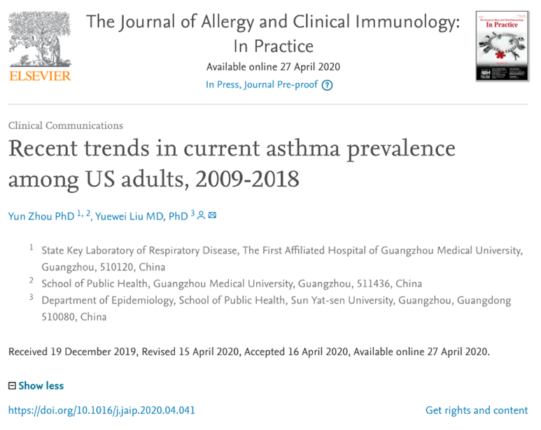2020年4月27日,免疫学领域国际著名杂志The Journal of Allergy and Clinical Immunology: In Practice(影响因子7.6)在线发表了公卫博彩网站推荐 周芸教授的短篇报道Recent trends in current asthma prevalence among US adults, 2009-2018。该研究通过分析2009至2018年的美国国家健康与营养调查(NHANES, National Health and Nutrition Examination Survey)数据,计算了近十年美国成人哮喘现患率及变化趋势。研究显示,2009-2014年间美国成人哮喘现患率逐渐上升,而从2015年起趋于稳定,2017-2018年间发病率达8.9%。该研究结果提示了重视成人哮喘防控的重要性。