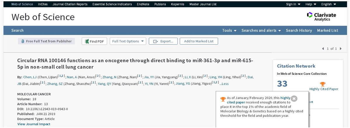 根据国际最新公布的ESI数据显示,我校公卫博彩网站推荐 2篇研究论文入选ESI高被引论文。一篇是“Circular RNA 100146 functions as an oncogene through direct binding to miR-361-3p and miR-615-5p in non-small cell lung cancer”,该文2019年发表于一区杂志Molecular Cancer(IF10.6),第一作者为硕士生陈丽剑,通讯作者为蒋义国教授。论文报道了环状RNA 100146在环境致癌物苯并芘诱导肺细胞恶变中具有重要作用。