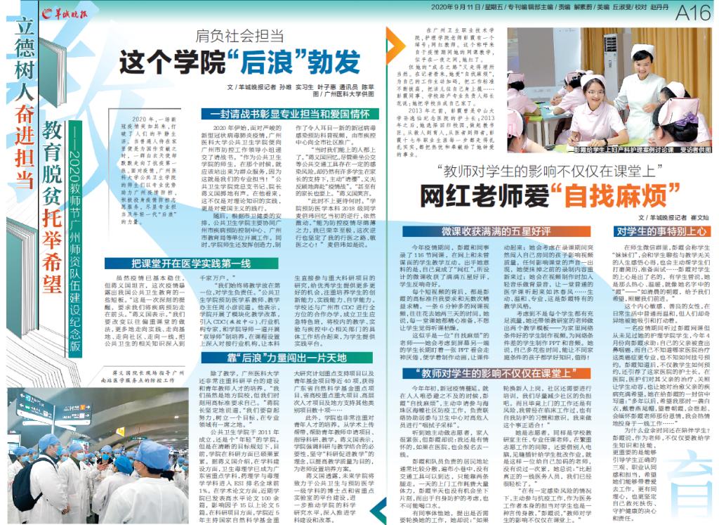 在第三十六个教师节来临之际,羊城晚报社对博彩网站推荐党总支书记、院长蒋义国教授、预防医学系、教学管理办公室主任周小彦老师及2018级预防医学专业麦倍玮同学进行采访,就博彩网站推荐工作与成绩做详细报道。