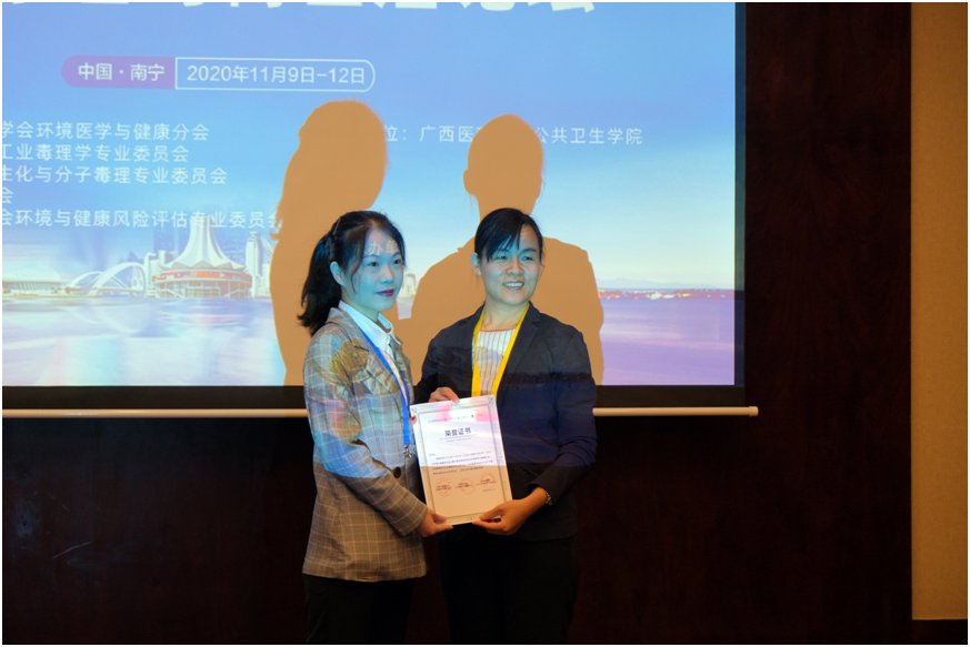 由中国环境科学学会环境医学与健康分会、中国毒理学会工业毒理专业委员会及生化与分子毒理专业委员会等单位联合主办的“2020环境与健康学术大会”,于2020年11月9-12日在广西南宁市召开。来自全国1000余名环境医学与毒理学及相关领域的专家学者出席了本次学术盛会。本次大会特别设立了青年学者及博士后报告专场,共遴选出50余名青年学者及博士后作口头报告,评出15位大会优秀报告奖。博彩网站推荐硕士研究生曾晖娴、张晗分别作了口头报告,其中曾晖娴的报告获得大会优秀报告奖。