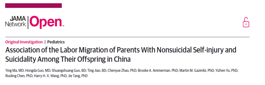 1月9日,博彩网站推荐唐杰教授团队及合作者在JAMA Network Open(中科院医学1区期刊)在线发表研究论文Associationof the labor migration of parents with nonsuicidal self-injury and suicidality among their offspring in China。博彩网站推荐 附属广州市妇女儿童医疗中心马颖副主任医师和公卫博彩网站推荐 研究生郭宏达为共同第一作者,唐杰教授为通讯作者。