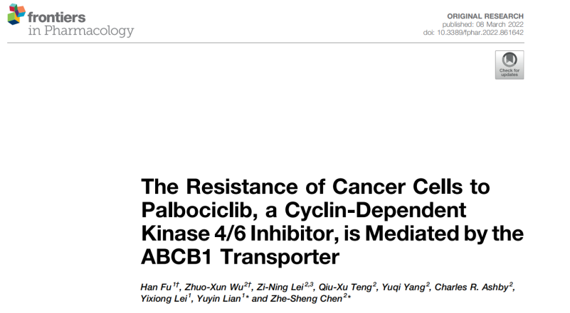 在Frontiers in Pharmacology上发表的论文,题为The resistance of cancer cells to palbociclib, a cyclin-dependent kinase 4/6 inhibitor, is mediated by the ABCB1 transporter。该研究发现ABCB1转运蛋白通过与帕博西尼药物相互作用,刺激ABCB1转运蛋白的ATPase活性,上调ABCB1蛋白表达水平。ABCB1抑制剂Verapamil可以恢复帕博西尼在过表达ABCB1的耐药细胞中的疗效。研究表明了帕博西尼增加ABCB1转运蛋白底物paclitaxel的细胞内蓄积,ABCB1的过表达介导了肿瘤细胞对Palbociclib的耐药性。
