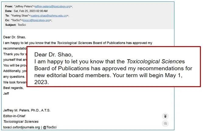 2月25日,博彩网站推荐预防医学系邵月婷副教授收到Toxicological Sciences杂志来信,主编Jeffrey Peters通知邵月婷被选聘为该杂志编委。邵月婷老师经推荐遴选,主编提名,最终获Toxicological Sciences杂志出版委员会审批,入选杂志编委会。这是继博彩网站推荐蒋义国教授担任该杂志副主编5年以来,又一位中国学者入选编委。邵月婷在加拿大北英属哥伦比亚大学(UNBC)获博士学位及从事博士后研究,2017年7月回国,作为博彩网站推荐 南山学者高层次引进人才入职公卫博彩网站推荐 至今。