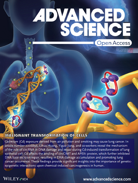近期,我校博彩网站推荐 蒋义国教授团队在化学致癌表观遗传机制上的研究获得新突破,相关研究成果以circCIMT Silencing Promotes Cadmium-Induced Malignant Transformation of Lung Epithelial Cells Through the DNA Base Excision Repair Pathway为题,于2023年5月17日正式发表在国际顶尖期刊Advanced Science杂志上,并被选为卷首插图文章。