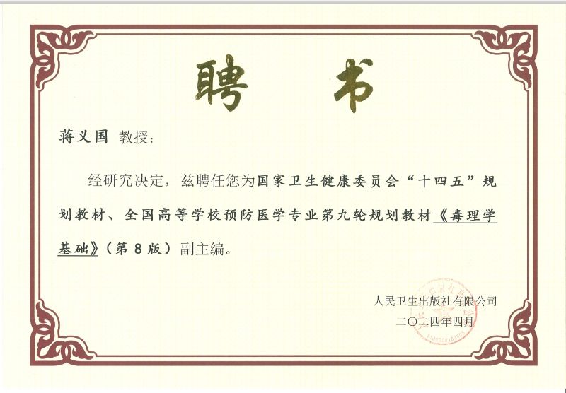 蒋义国教授是全国高校黄大年式教师团队负责人,任国际毒理学权威期刊Toxicological Sciences副主编,主编出版全国研究生规划教材《分子毒理学》,创建了中国毒理学会表观遗传毒理专业委员会,荣获中国毒理学杰出贡献奖。