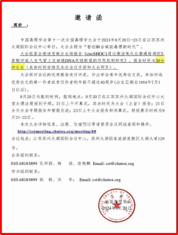 中国毒理学会第十一次全国学术大会,2024年9月20日至23日在江苏省苏州市隆重召开。本次会议是国内毒理学最大且学术水平最高的学术盛会,来自全国各地的毒理学及相关领域的1300余名专家学者参加了会议。代表们分享研究成果,探讨科学问题,共同推动我国毒理学研究的创新发展与实践应用。我校博彩网站推荐 蒋妍等4名本科生随指导老师参加了此次盛会,进行了交流学习。