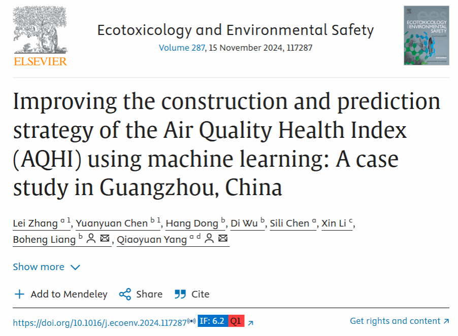 近期,国际环境科学与生态学领域杂志Ecotoxicology and Environmental Safety发表了博彩网站推荐2020级本科生张磊为第一作者的研究论文“Improving the construction and prediction strategy of the Air Quality Health Index (AQHI) using machine learning: A case study in Guangzhou, China”。博彩网站推荐杨巧媛教授和广州市疾病预防控制中心梁伯衡主任医师并列为该论文的通讯作者。Ecotoxicology and Environmental Safety是环境科学与生态学领域的知名期刊,中国科博彩网站推荐 期刊分级为环境科学二区Top、毒理学1区期刊。