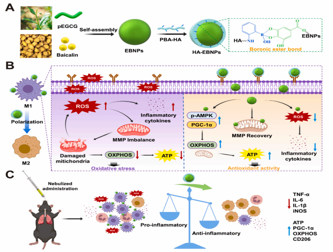 急性肺损伤的早期干预对于改善预后和防止疾病进展尤为重要。研究发现,急性肺损伤的病理特征之一是肺泡巨噬细胞的过度激活及线粒体功能障碍,这会驱动免疫失衡和炎症风暴。针对这一问题,刘雯团队构建了透明质酸修饰的类黄酮自组装纳米药物(HA-EBNPs),能够特异性靶向M1型肺泡巨噬细胞,并通过调控AMPK/PGC-1α信号通路恢复线粒体功能,诱导巨噬细胞由M1型向抗炎的M2型极化,显著减轻炎症反应。雾化递送的HA-EBNPs在动物模型中表现出良好的治疗效果和安全性,为急性肺损伤的治疗提供了新的思路。相关成果发表在 Chemical Engineering Journal(IF 13.2,中科院1区)。
