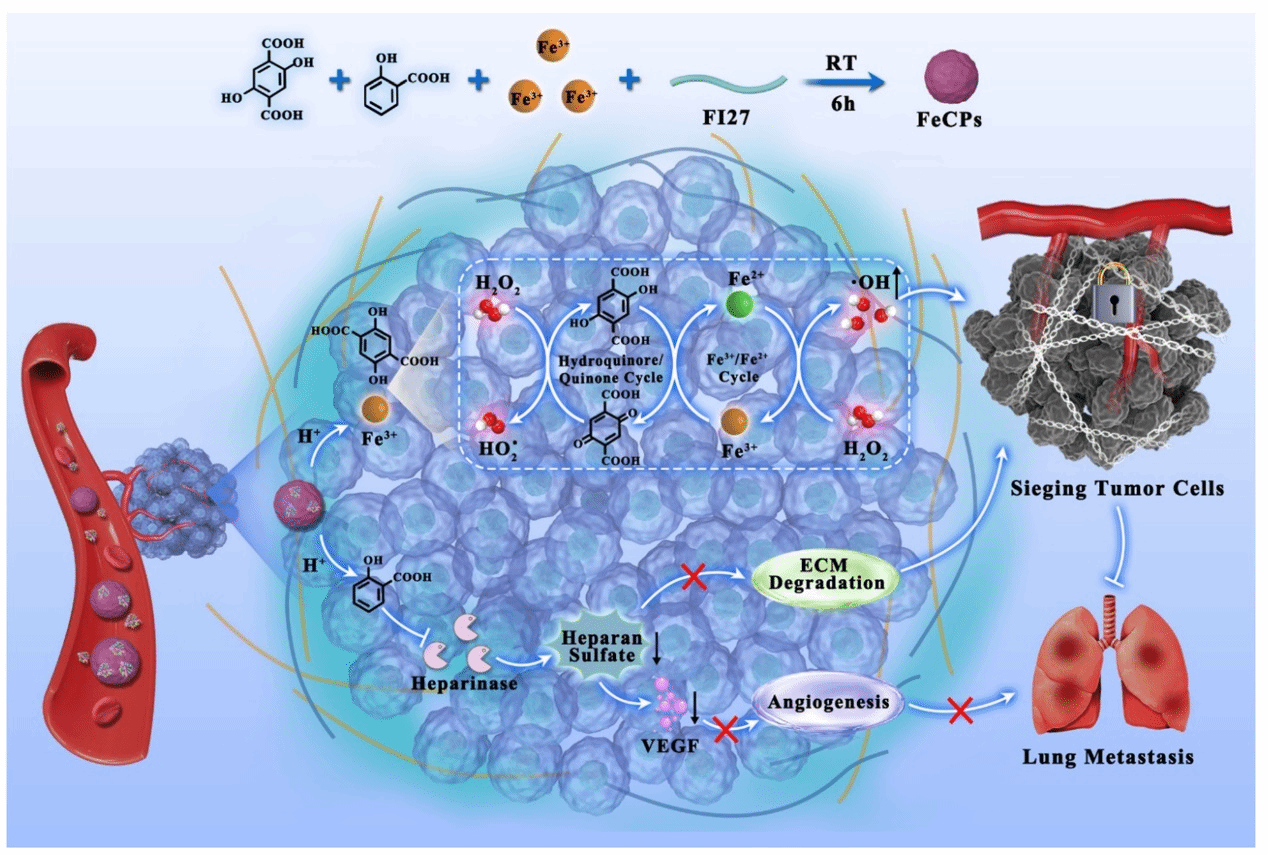在研究肺部恶性转化机制的基础上,团队进一步探索了肿瘤干预新策略。针对传统治疗常导致细胞外基质(ECM)破坏、反而加速转移的难题,团队提出了一种“围攻肿瘤细胞”的新思路。设计了铁配位聚合物(FeCPs),该策略在肿瘤酸性微环境中可释放水杨酸(SA)、2,5-二羟基对苯二甲酸(DHTA)和Fe3+离子,实现双重作用:一方面,SA抑制肝素酶以巩固ECM并锚定肿瘤细胞;另一方面,DHTA增强铁离子介导的化学动力学治疗,协同抑制肿瘤生长和转移。动物实验表明,该方法可使肺转移率降低约90%,显著提高小鼠生存率。该研究成果发表在 Materials Horizons (IF 10.7,中科院2区)。