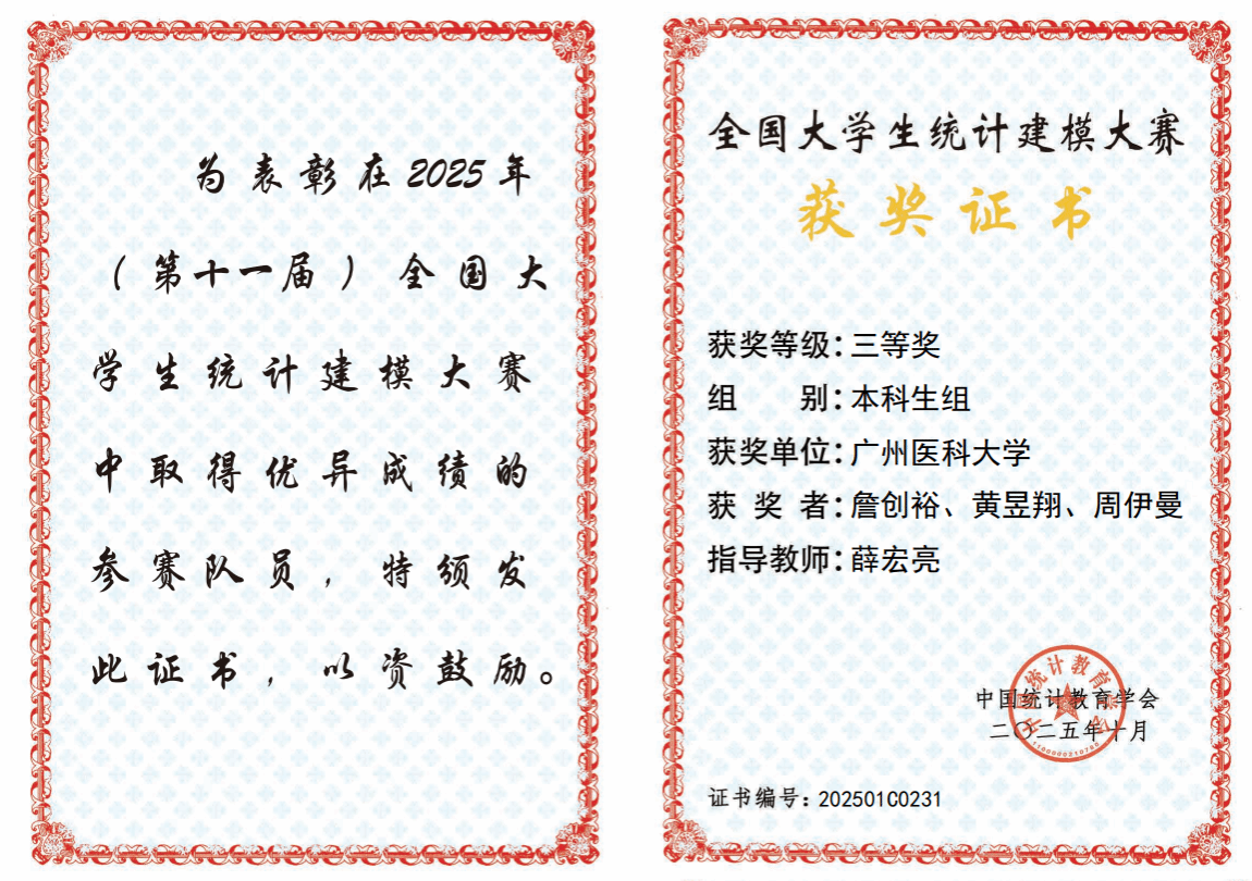 在薛宏亮老师指导下,博彩网站推荐食品卫生与营养学专业詹创裕等本科生团队,凭借扎实的专业功底、出色的跨学科应用能力与团队协作精神,荣获全国三等奖。此次获奖是博彩网站推荐自统计建模大赛设立校赛、省赛与国赛三级赛事机制以来,首次有学生团队入围国赛并获奖,展现了博彩网站推荐学生突出的创新实践能力,也体现了博彩网站推荐在推进教育教学改革、强化学科交叉融合人才培养模式方面的显著成效。